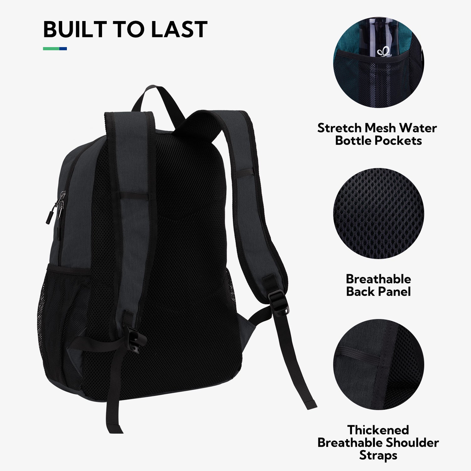 • Two 6.5"H x 6"W elastic-banded mesh water bottle pockets.